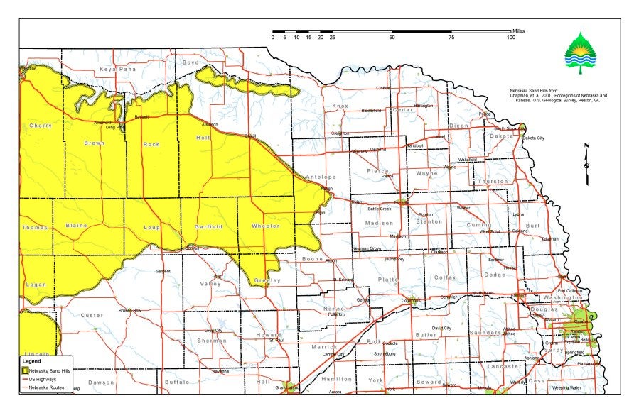 Attached is a map from NDEQ that shows an outline of the Sandhills region in Nebraska. The more comprehensive map that delineates a variety of ecoregions in both Nebraska and Kansas can be found on EPA’s web site, at: ftp://ftp.epa.gov/wed/ecoregions/ks/ksne_eco_pg.pdf