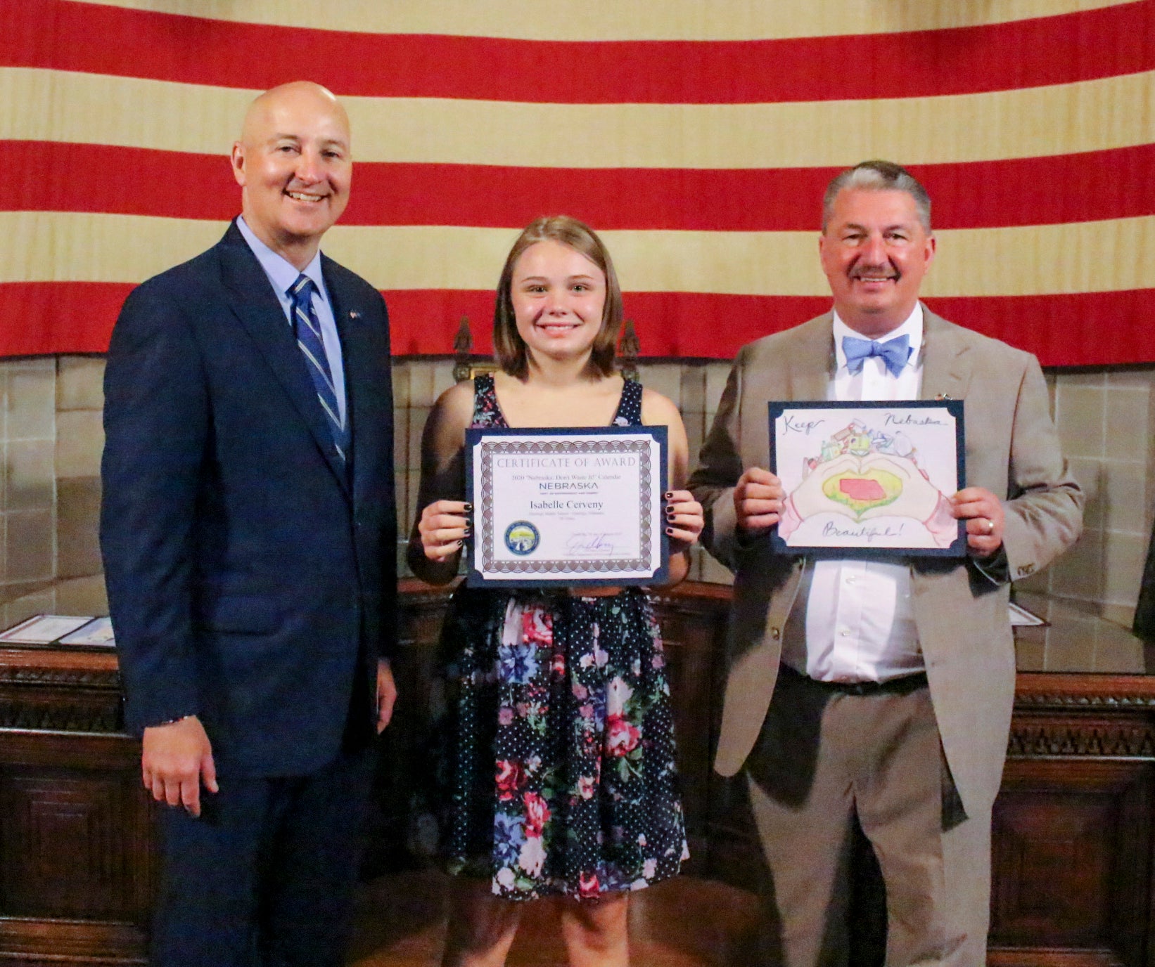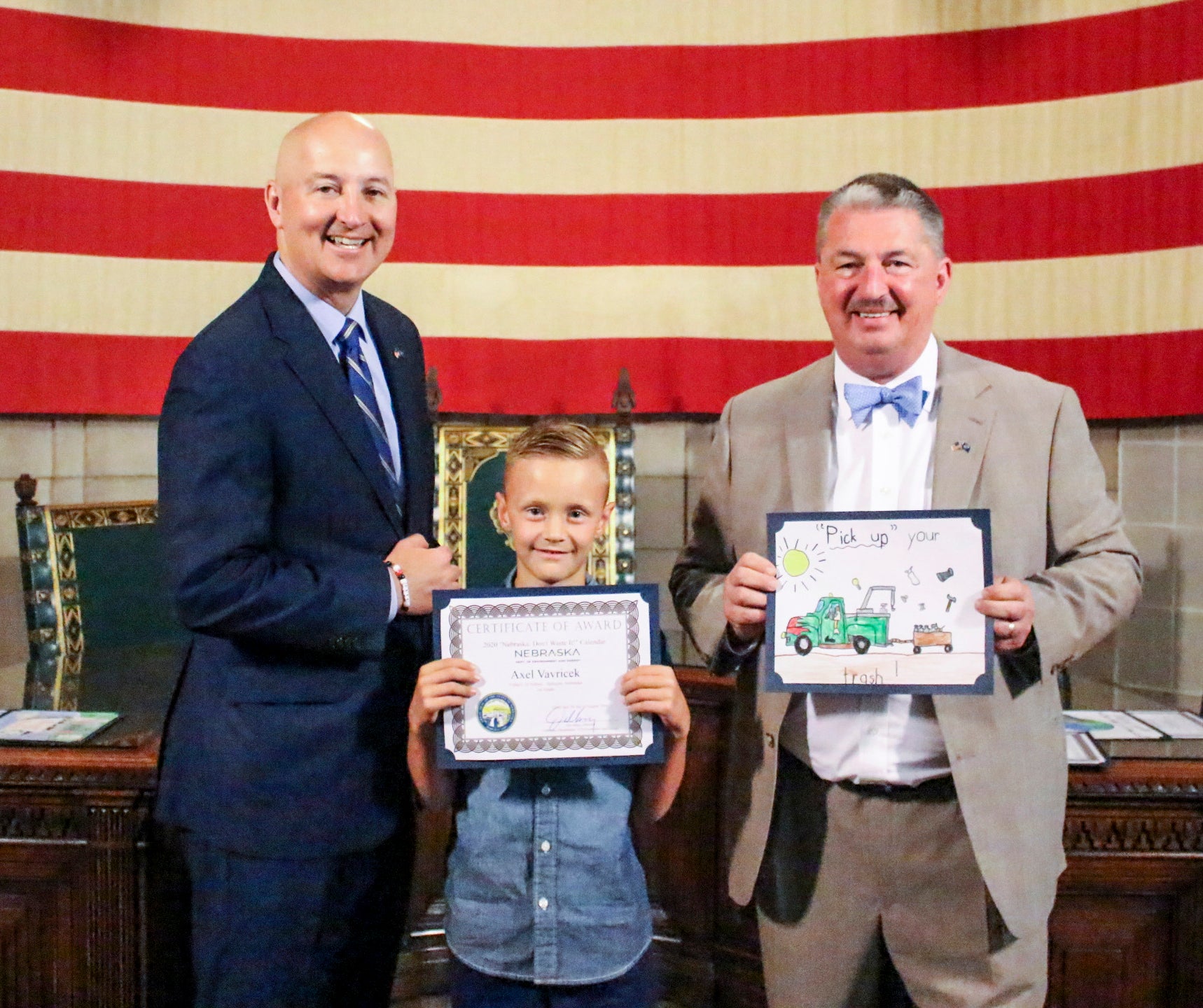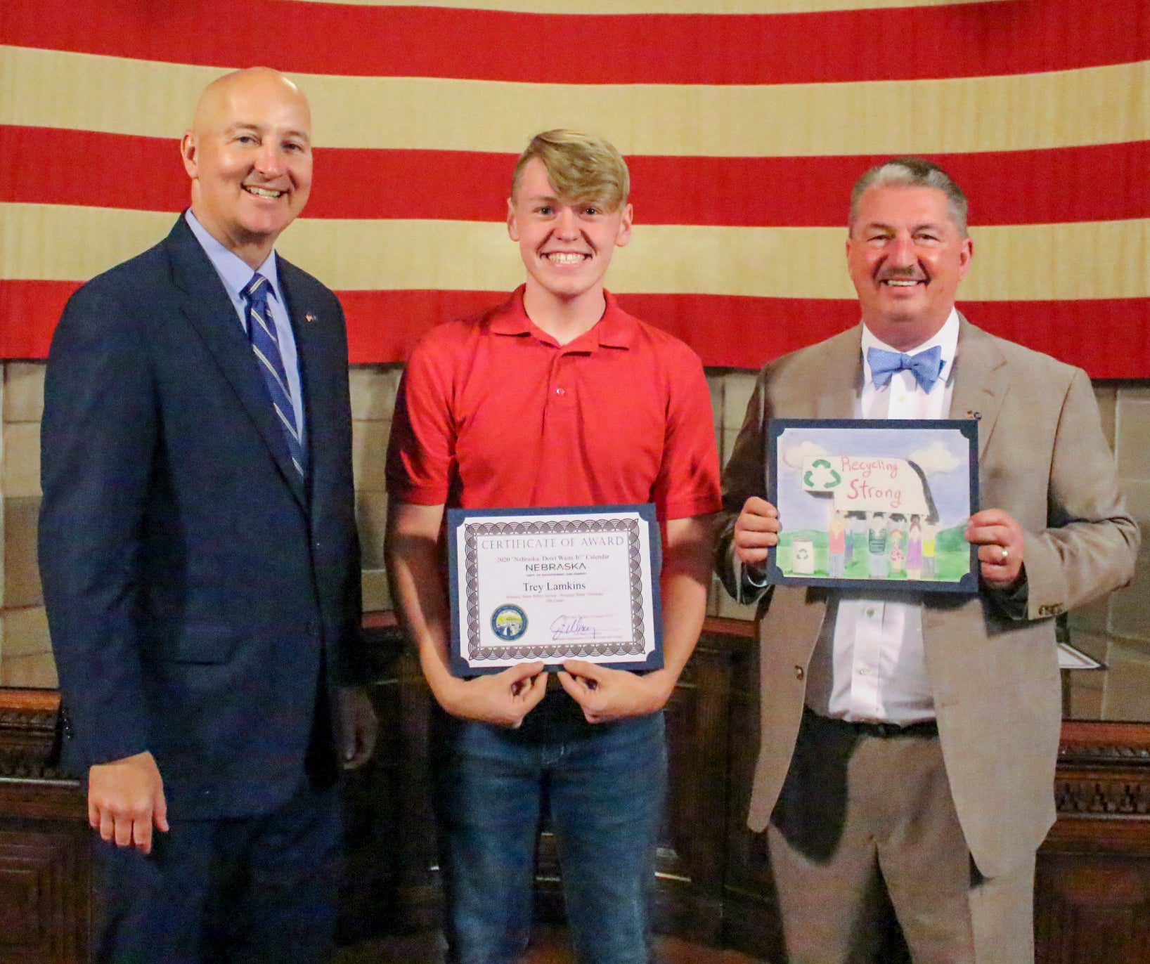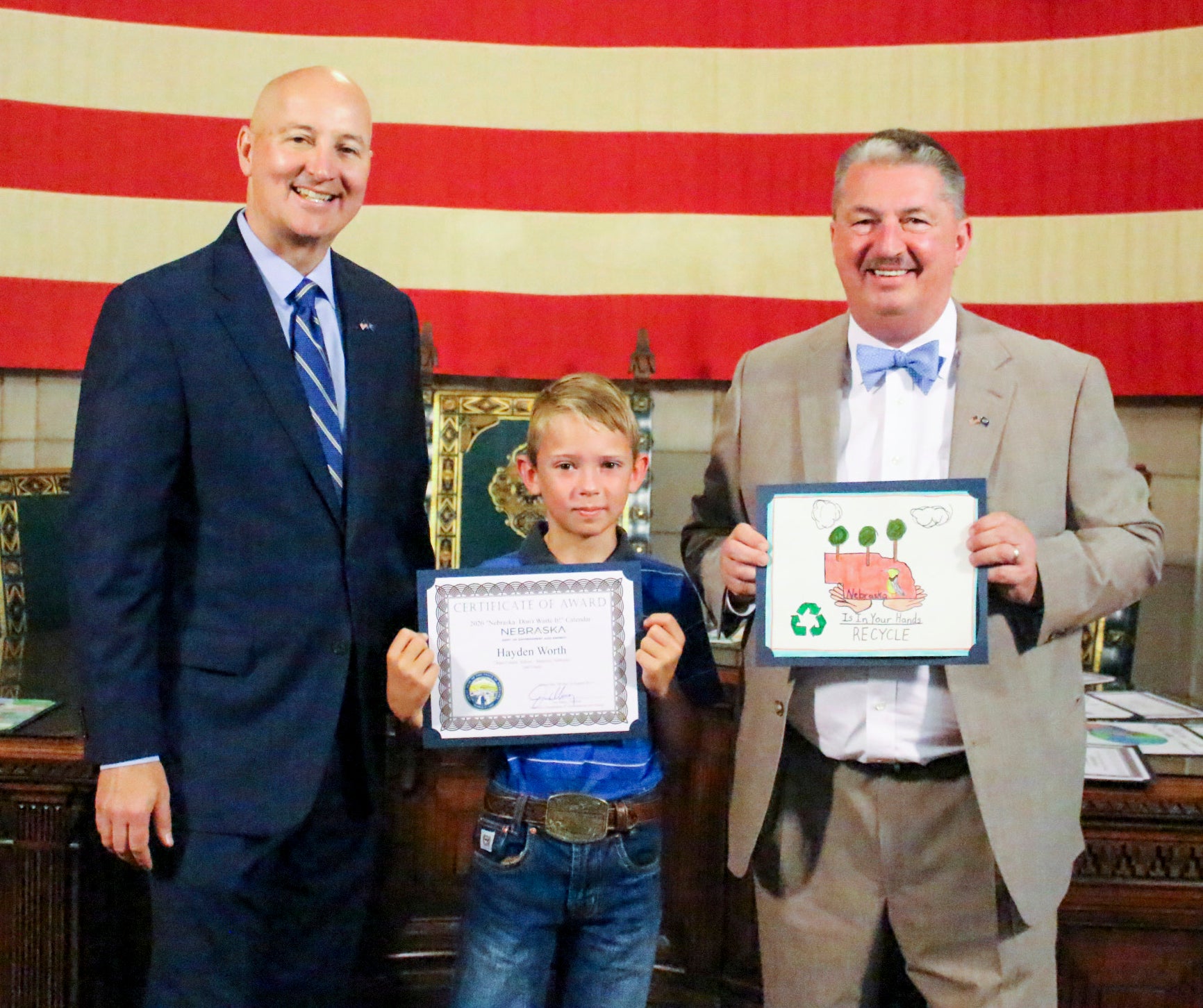 Below are photos of the individual contest winners, taken at the Aug. 7 ceremony. In each photo, Gov. Pete Ricketts is at left, and DWEE Director Jim Macy is at right. The last attachment is a photo of the entire group.