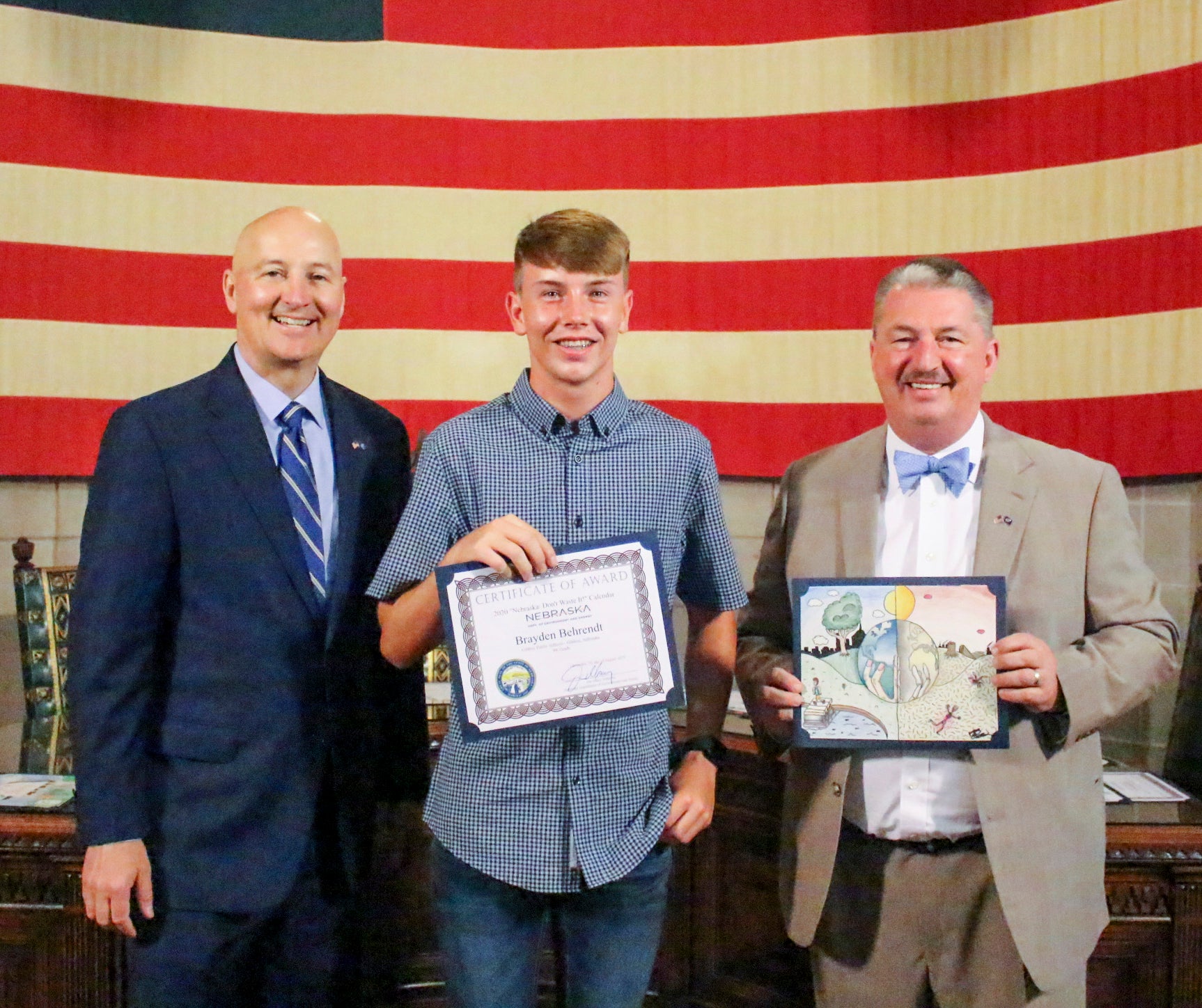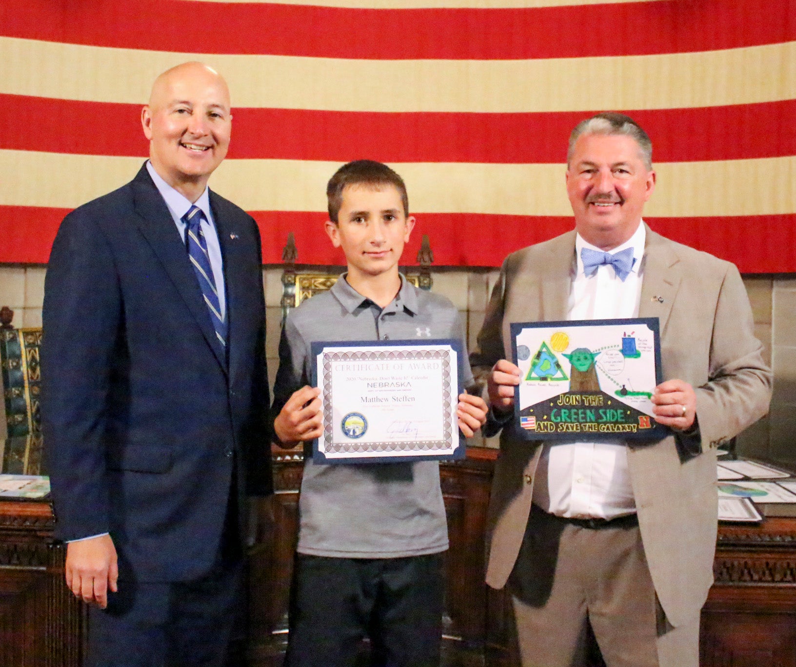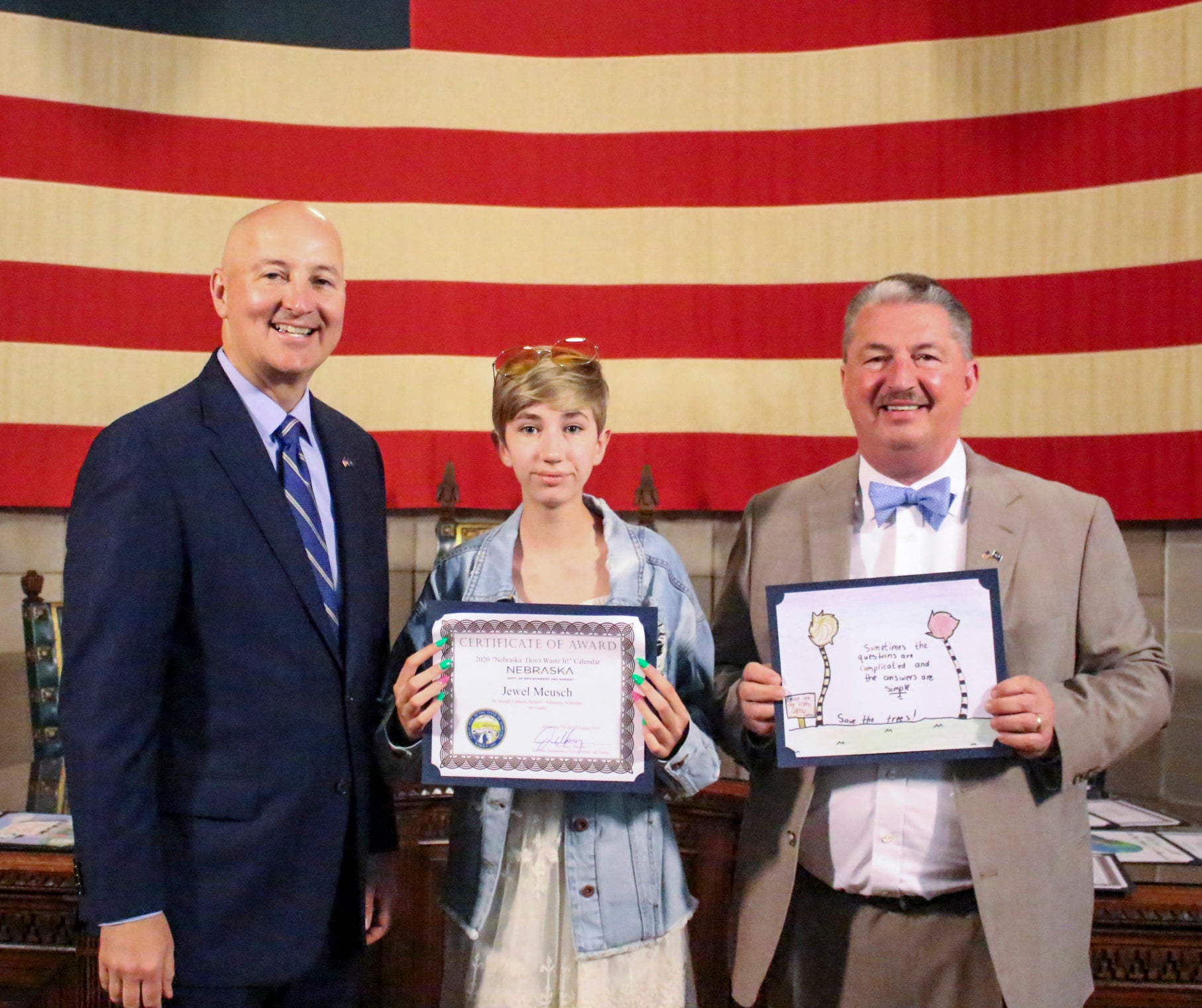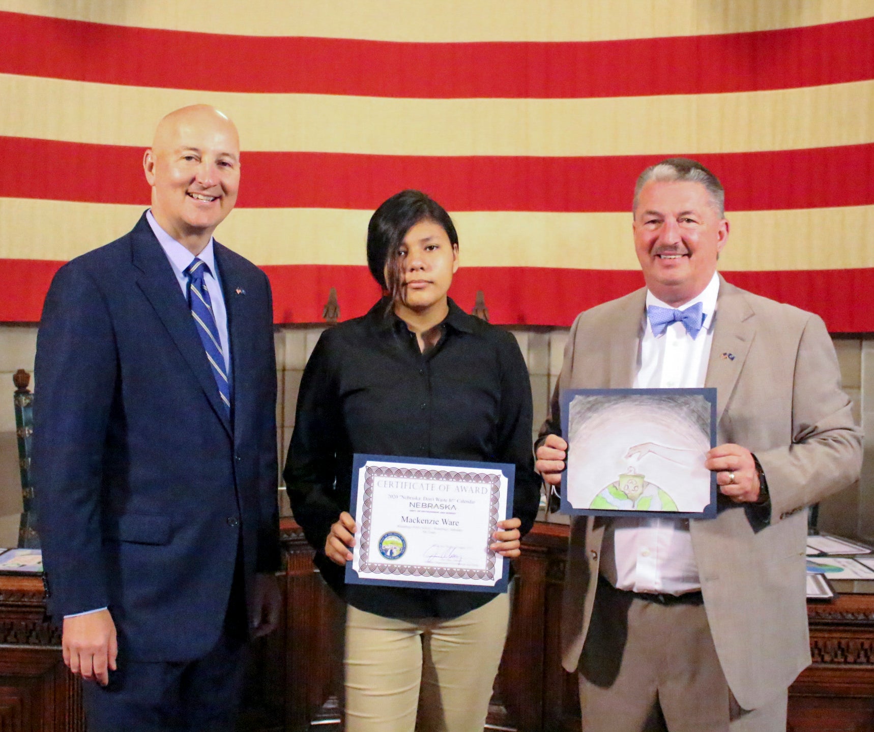 The students whose submissions were selected for the 2020 calendar were invited to a ceremony at the State Capitol on Wednesday, August 7, where they were honored by Gov. Pete Ricketts and DWEE Director Jim Macy. Each month, the calendar features one of the 12 winning environmental posters. A 13th winner’s artwork provides the cover for the calendar.
