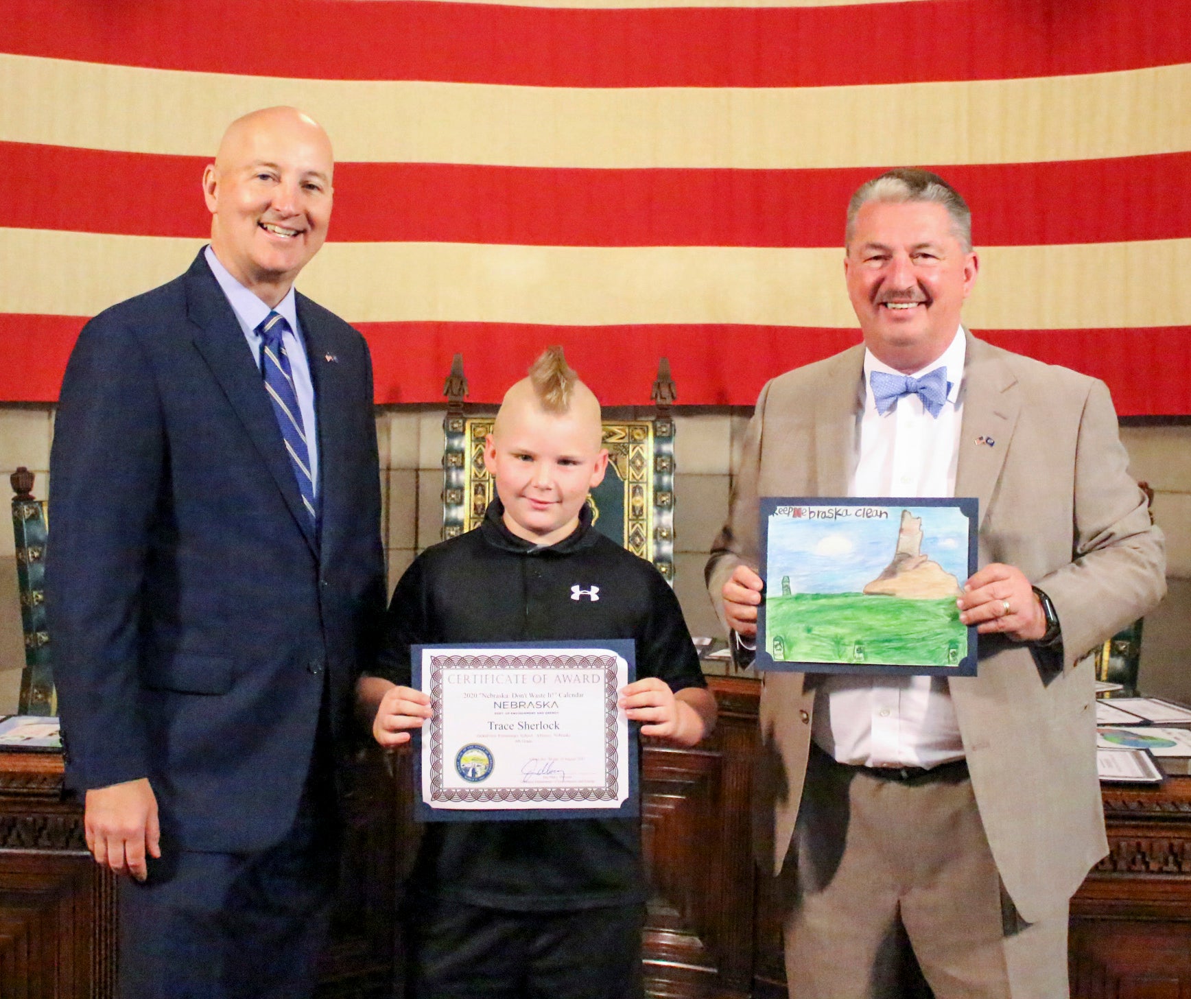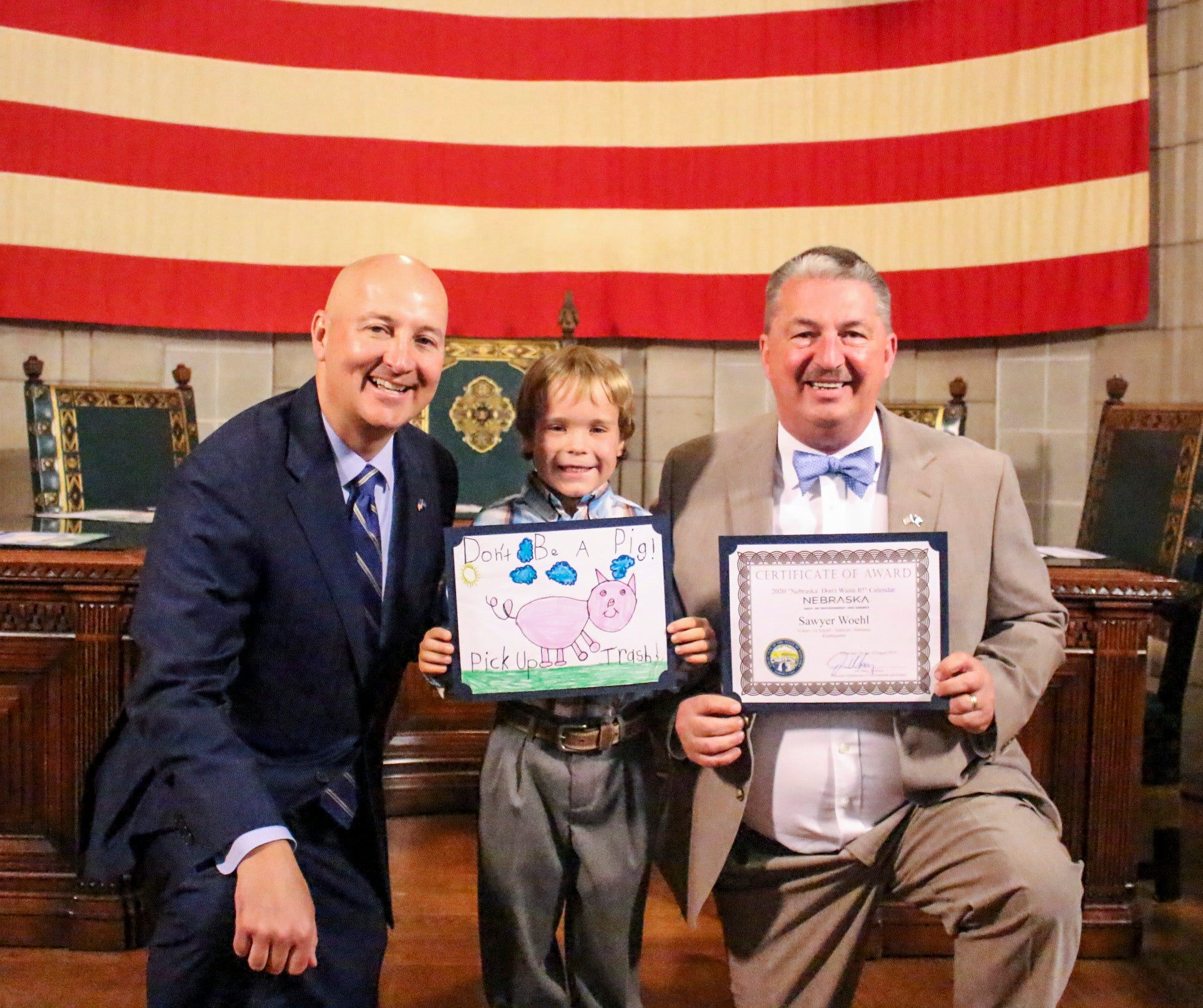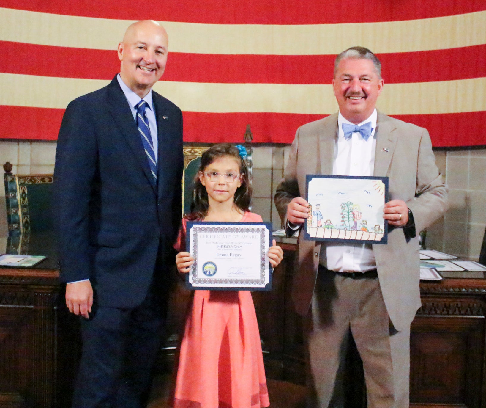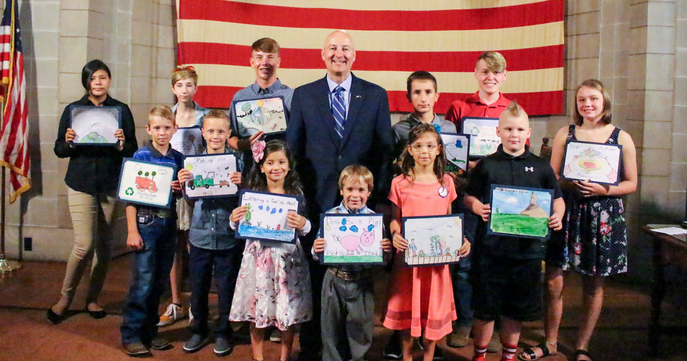 The students whose submissions were selected for the 2020 calendar were invited to a ceremony at the State Capitol on Wednesday, August 7, where they were honored by Gov. Pete Ricketts and DWEE Director Jim Macy. Each month, the calendar features one of the 12 winning environmental posters. A 13th winner’s artwork provides the cover for the calendar.