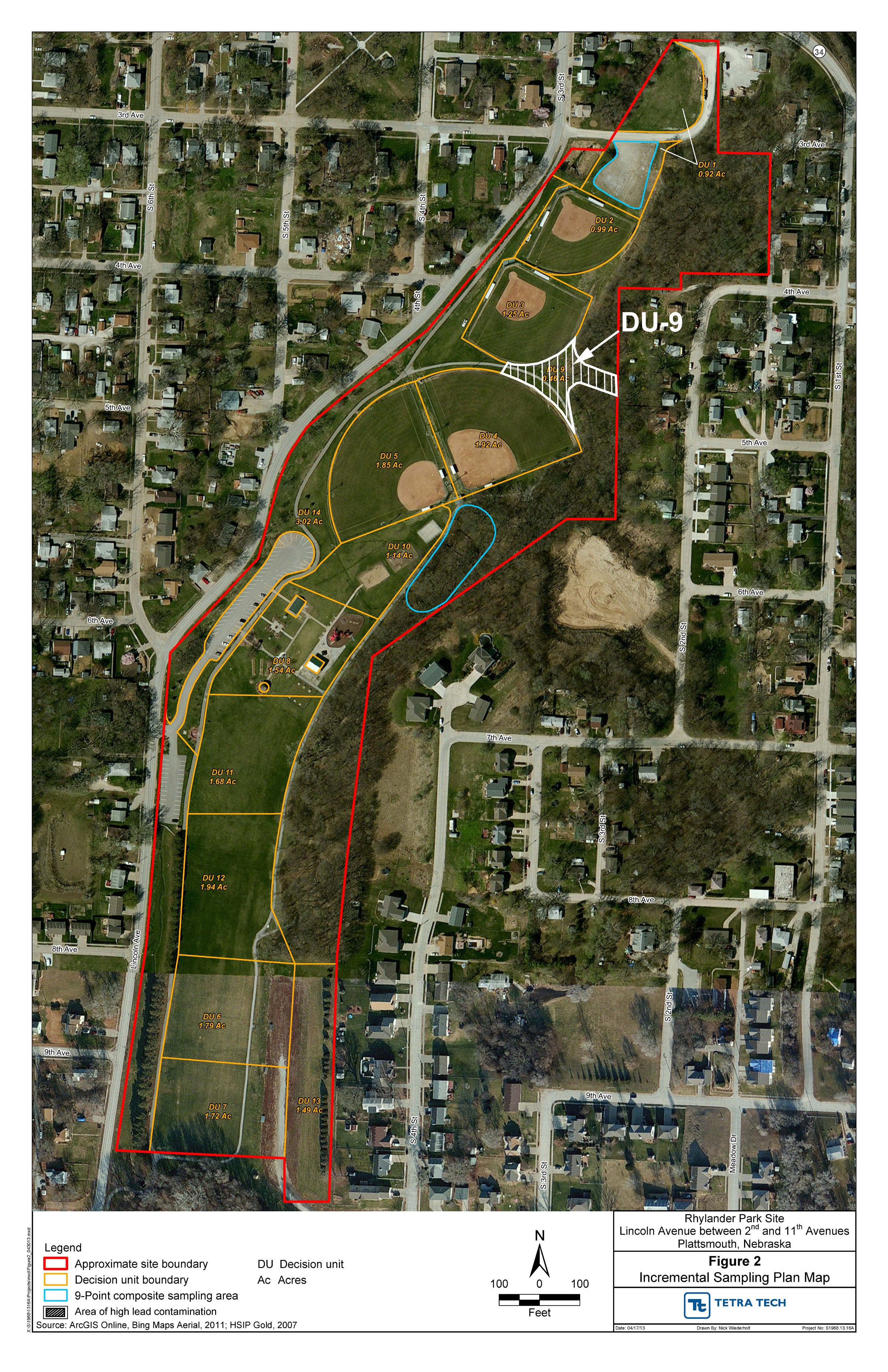 The Nebraska Department of Environmental Quality, in conjunction with the Nebraska Department of Health and Human Services and the City of Plattsmouth, have determined that a half-acre area on the east side of the park contains lead at levels that will require additional investigation. The affected area, which is referred to as Decision Unit 9 (DU-9), is located east of the softball fields and has a dirt path that leads to a residential area (see attached map).