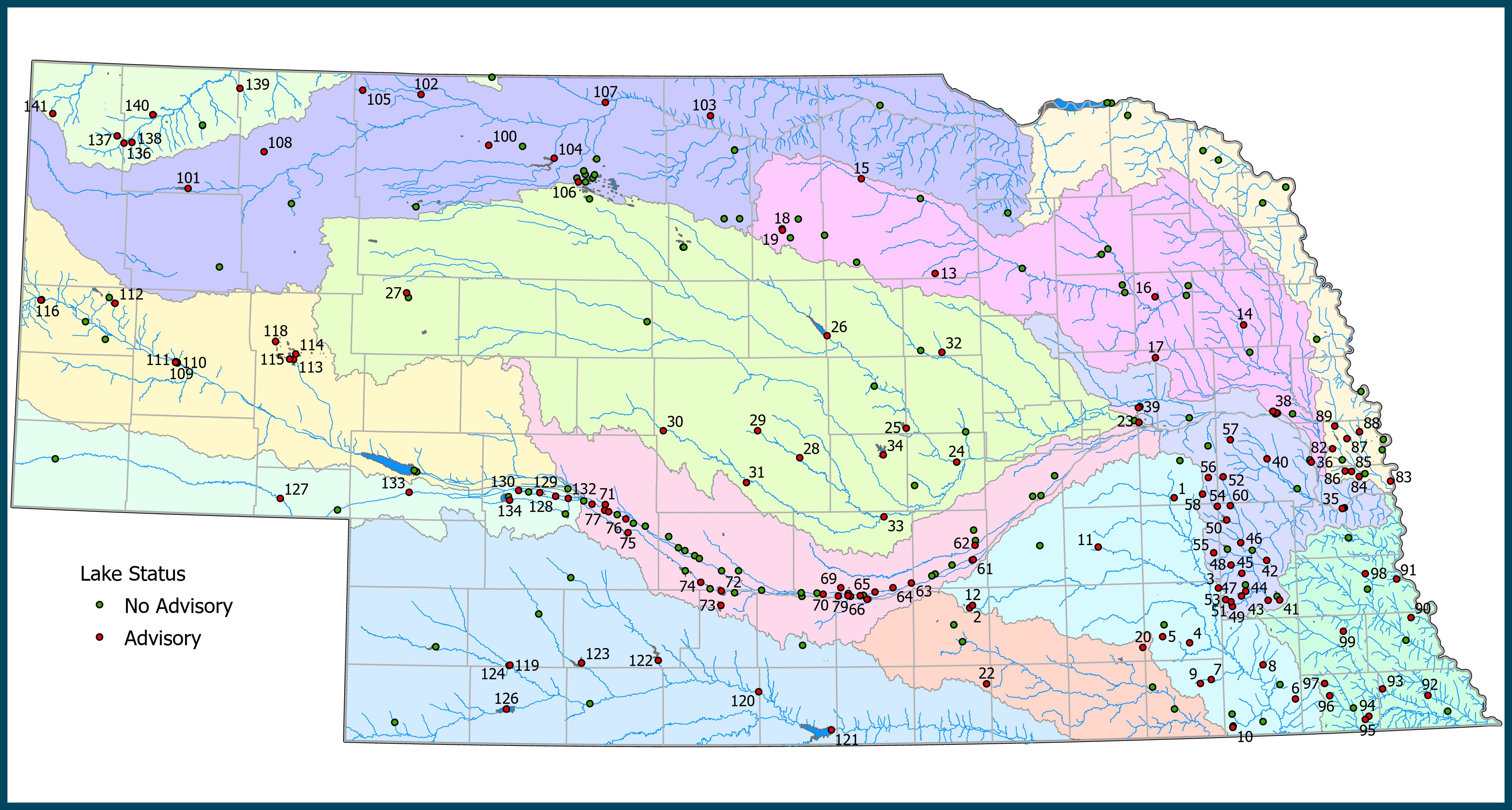 Fish consumption advisories are in effect at the Nebraska lakes and stream segments listed on the table below. Samples are collected by the Nebraska Department of Water, Energy, and Environment, analyzed by the U.S. Environmental Protection Agency and advisories are issued by the Nebraska Department of Health and Human Services. A more detailed explanation of the sampling program can be found in the document, “Regional Ambient Fish Tissue Program: 2024 Assessment Report.”